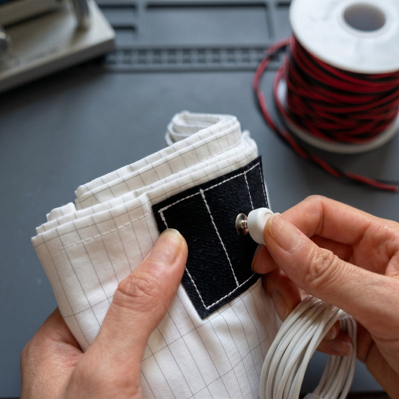 95% organic cotton finely woven with 5% pure conductive silver fiber — soft, breathable, anti-static, and dermatologically safe.